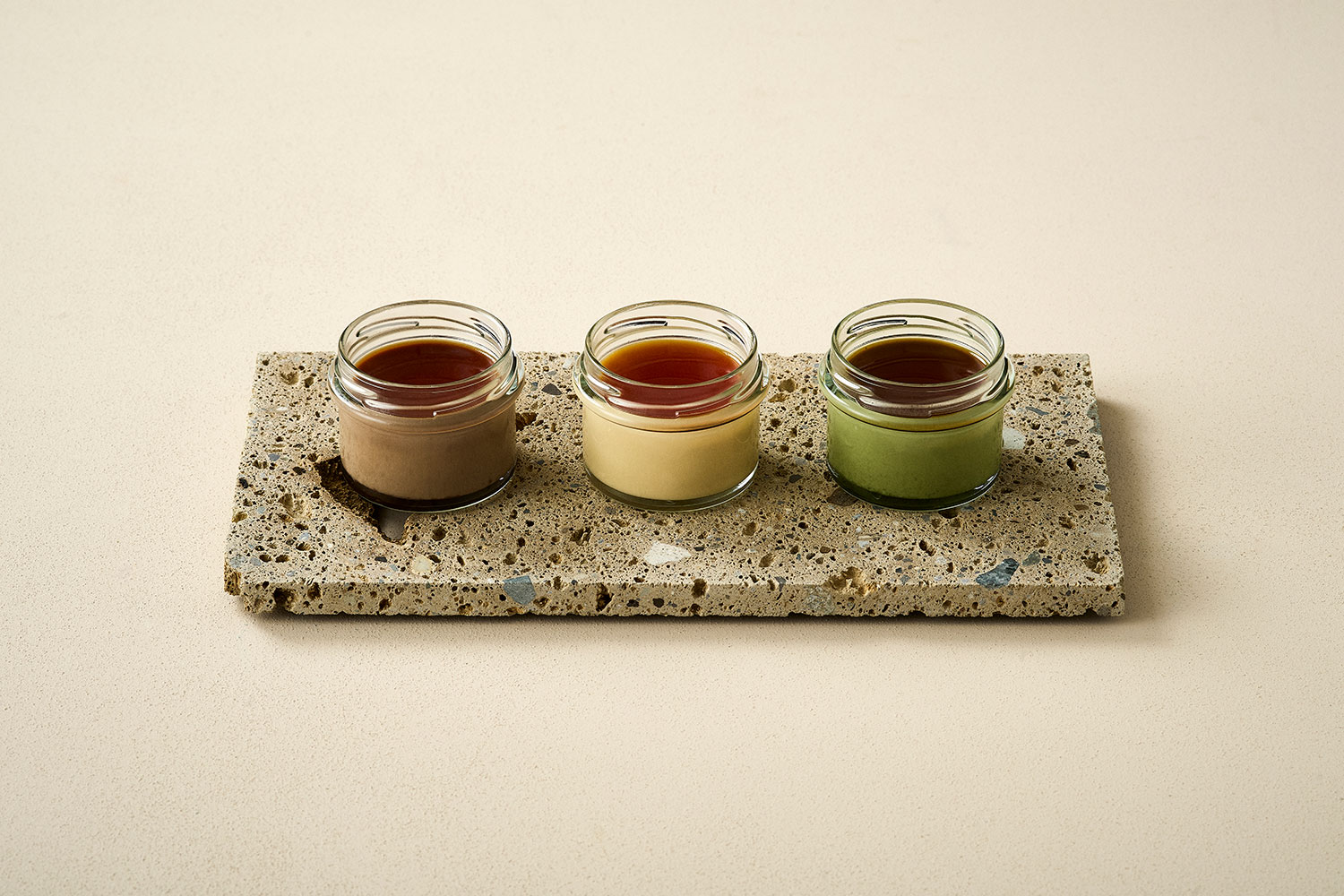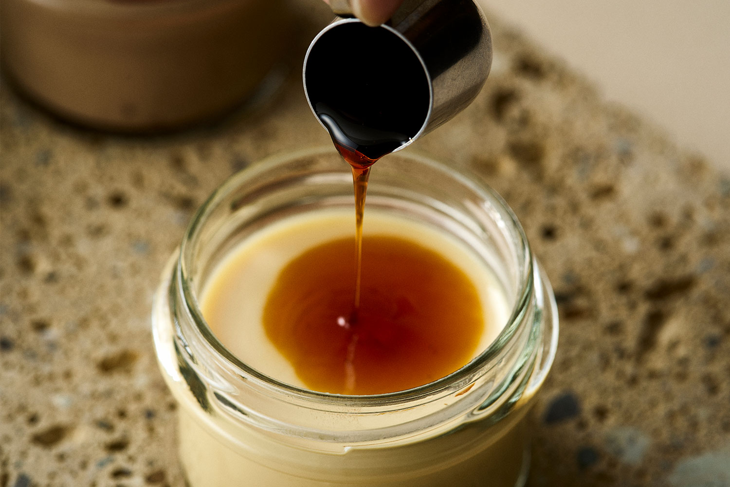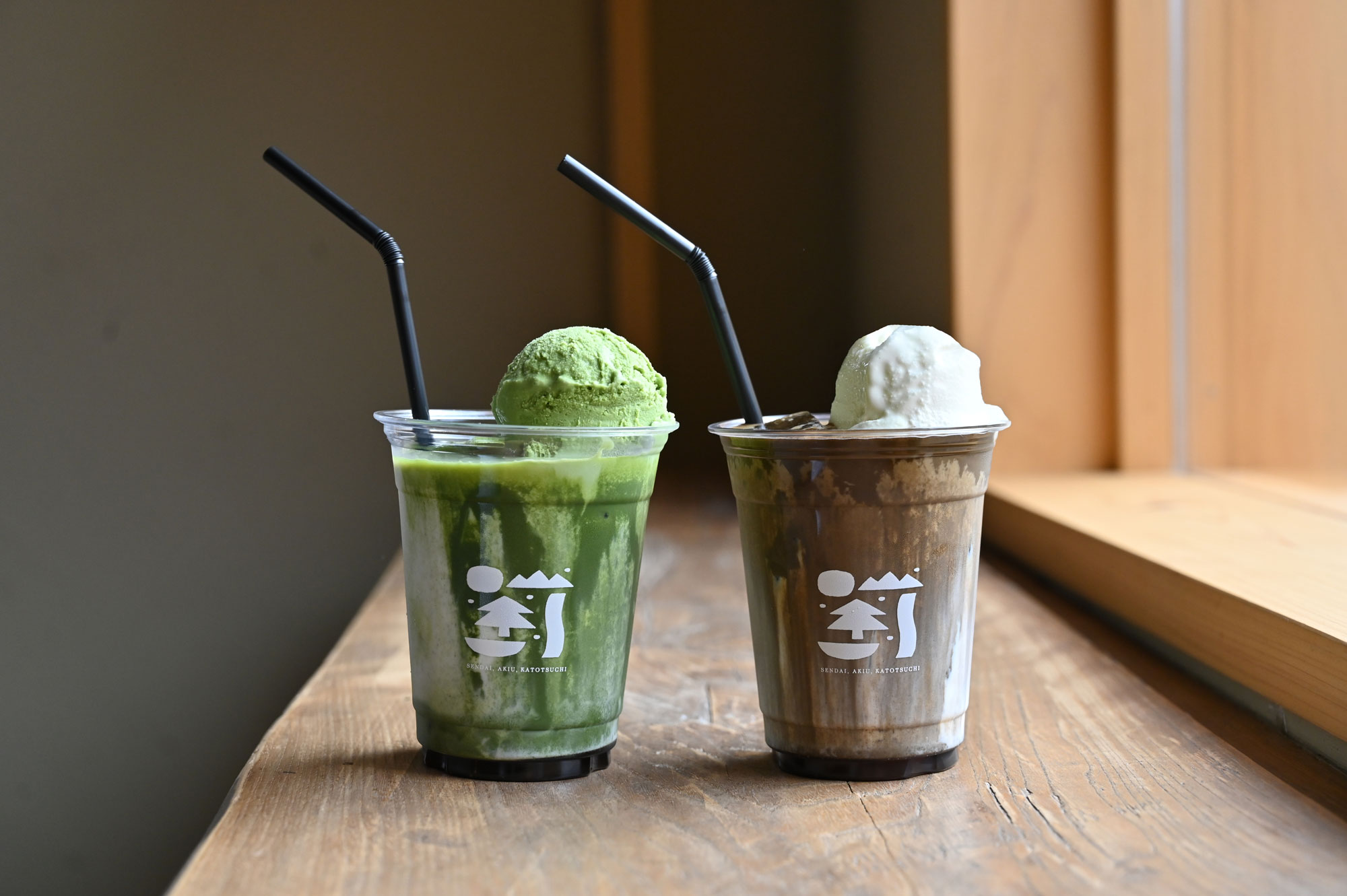 カップの底に黒みつを敷き、冷たいミルクと濃厚な宇治抹茶またはほうじ茶を上から注ぎアイスクリームをのせた、まるでスイーツのようなドリンクです。カップ底の黒みつをよくかき混ぜてからお召し上がりください。
