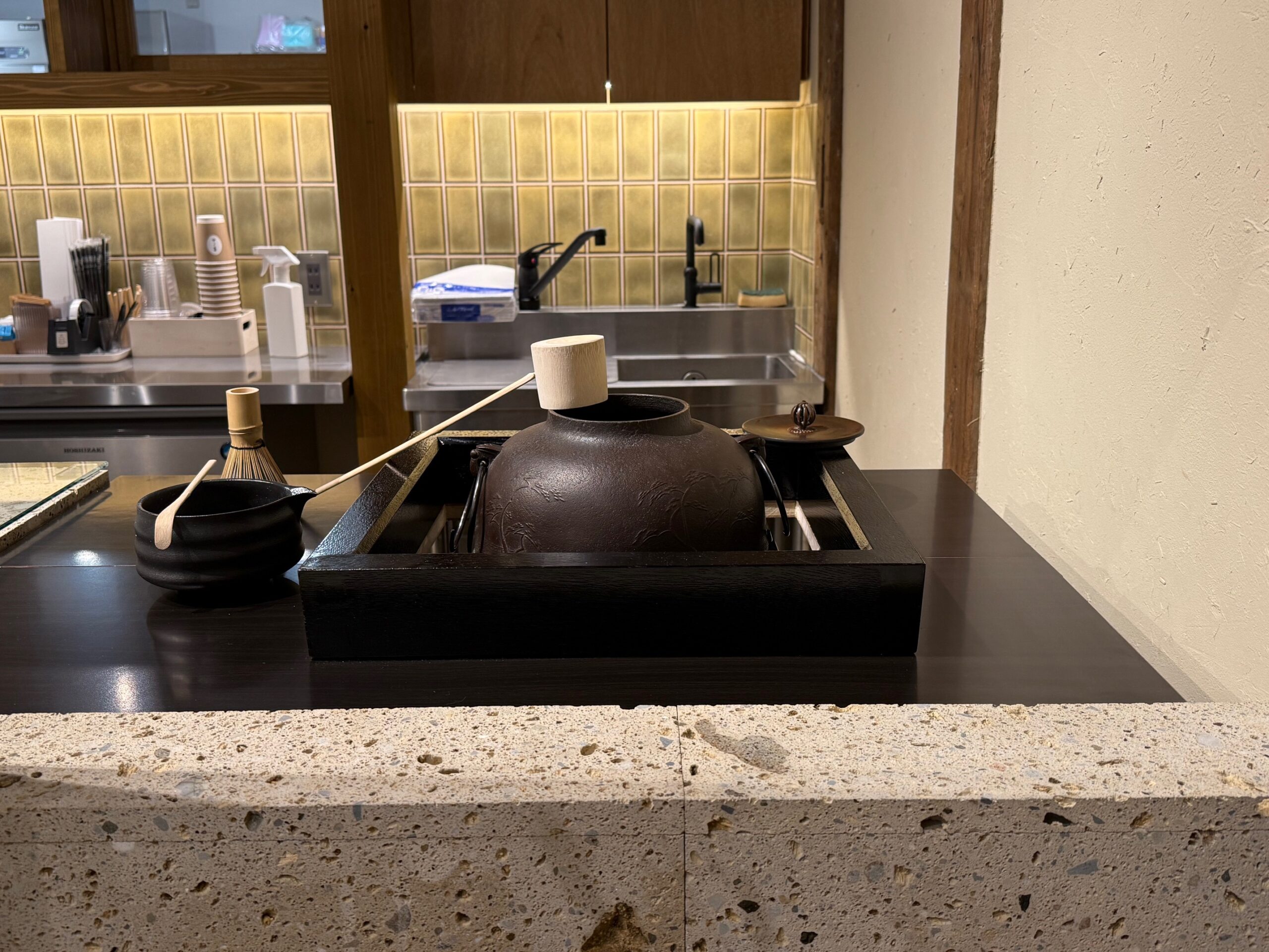 毎日、手ごねで作っている当店の自家製の白玉だんごに抹茶アイスをのせて、その上から茶釜で沸かしたお湯でたてた濃厚な宇治抹茶を注ぎます。最後に和菓子に使われる高級砂糖、和三盆を贅沢にふりかけ仕上げます。 (店内限定スイーツ・温かいほうじ茶とアンコがつきます)
