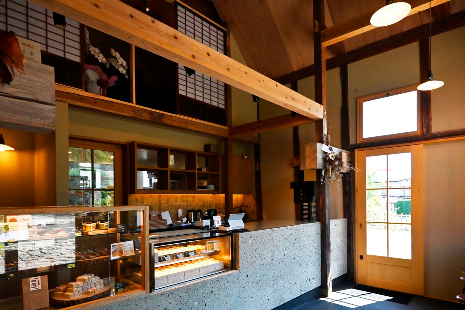 店内は1階フロアは販売カウンターとお庭の景観を楽しみながらご飲食ができるカウンター席となっております。
